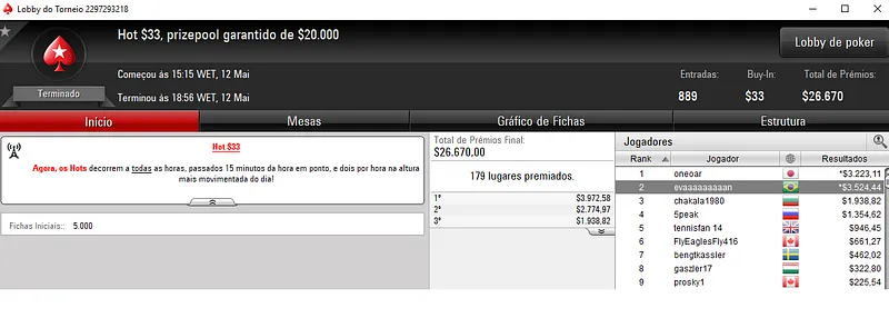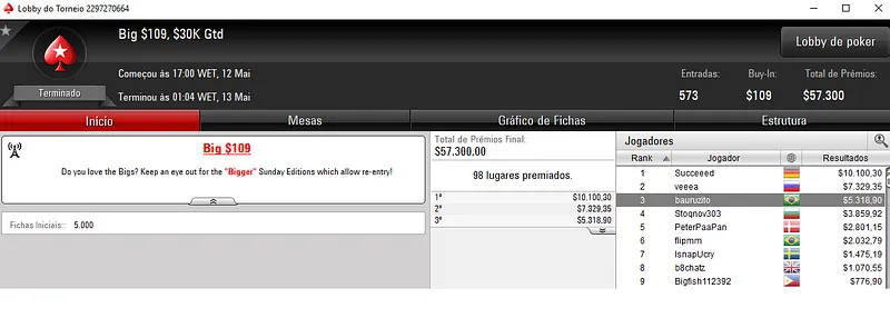 Mais uma cravada apareceu no Big $11 com 4,467 jogadores. Aqui, 800 jogadores repartiram o prize pool de $43,776 e $aymon9 levou para a sua conta $5,933.