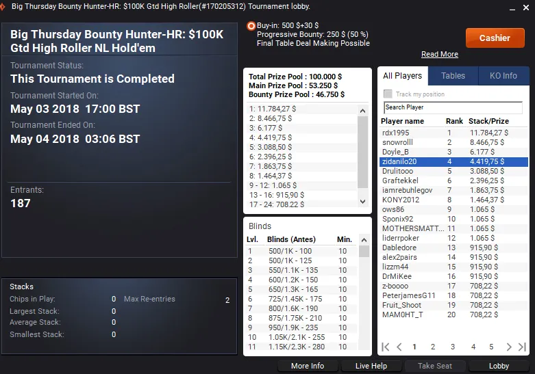 Quem também se deu bem nos panos virtuais do partypoker foi Rafael "rafaelmoraesgm" Moraes que terminou o Big Thursday Bounty Hunter High Roller na quarta colocação para forrar $8,996, entre prêmio e bounties.
