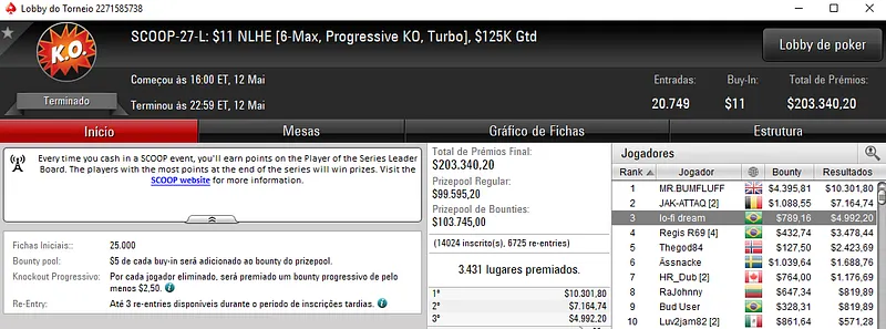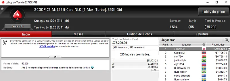 Já no SCOOP #27-Medium, zeeh_pb ficou perto do pódio e teve direito a $17,269, entre prêmio e bounties. Este torneio acolheu 6,272 entradas e o prize pool de $627,200 foi repartido pelos 875 melhores classificados.