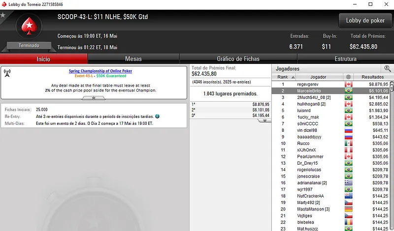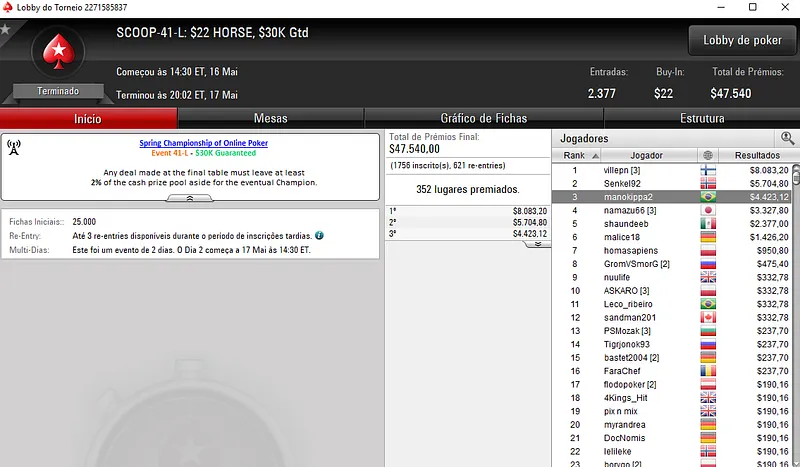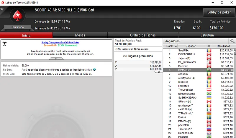 | Sex. Maio 18 | 9:00 | SCOOP-47-L - $5.50 NLHE [8-Max] | $30,000 |