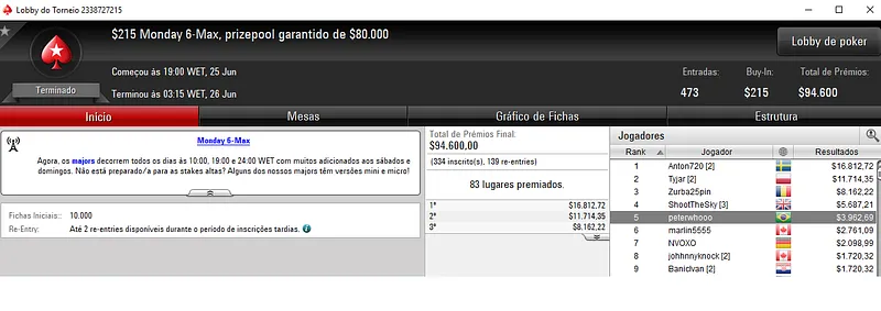 A conquista do Mini Monday 6-Max valeu $10,700 a bombexploded. O jogador nacional enfrentou 3,739 adversários para embolsar a maior premiação entre os $74,800 distribuídos.