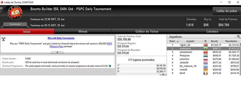 Já no Bounty Builder $33 com 1,968 jogadores assistimos a nova cravada brasuca. Desta vez, alexrod99 ficou com o título e encaixou $7,235, entre prêmio e bounties. No total, foram repartidos $59,040 de prize pool acumulado.