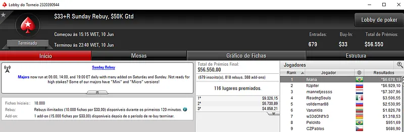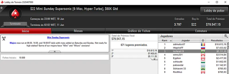 A medalha de prata no Sunday Supersonic valeu $18,853 a Fernando "fviana" Viana. O Sunday Supersonic acolheu 744 entradas e o prize pool chegou aos $152,341. Na terceira colocação, henrynobrega embolsou $13,702. Já Douglas "Dowgh-Santos" Ferreira foi quinto para $7,237.