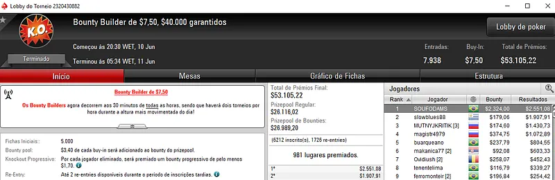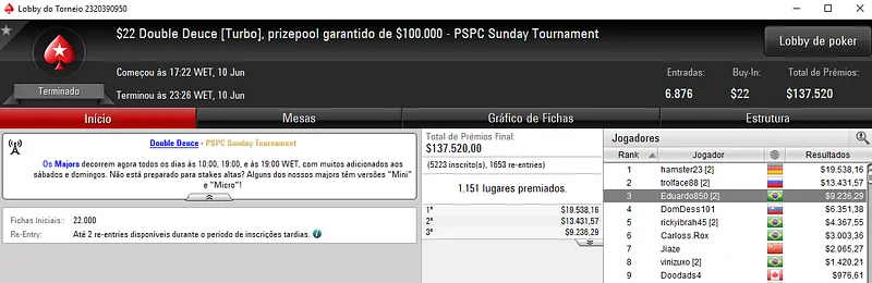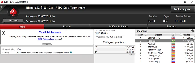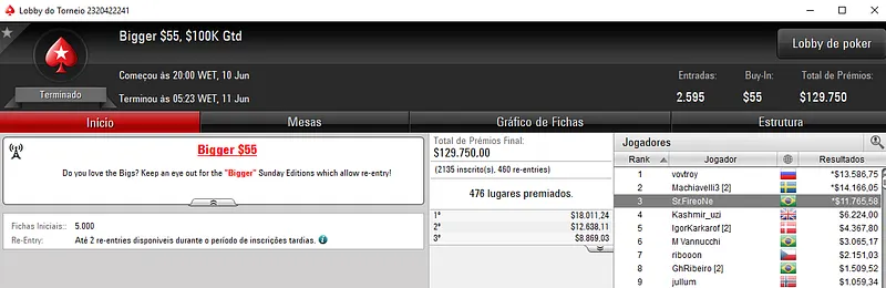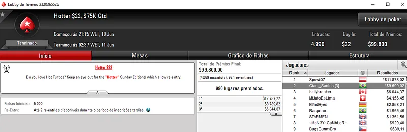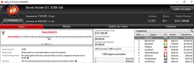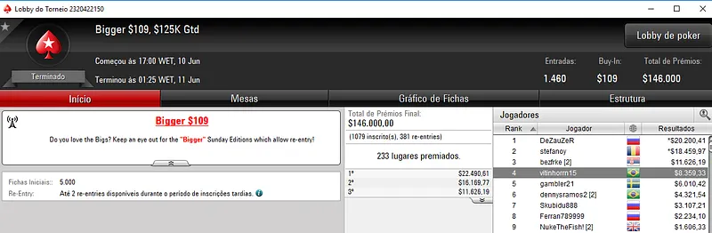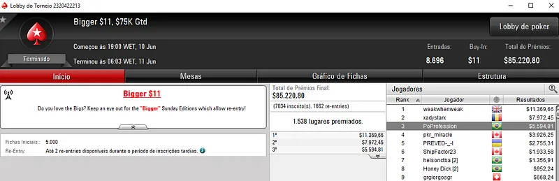 Já Pedro "pvigar" Garagnani andou a sambar nos ventos da sala de poker online e amealhou dois grandes resultados. O maior foi o segundo lugar no Bounty Builder $215 com 946 jogadores, onde embolsou $15,396 de prêmio.