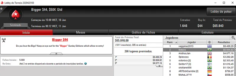 A maior forra apareceu com a medalha de prata de cigarromata no Sunday High Roller com 95 entradas e $190,000 de prize pool. Apenas 13 jogadores saíram com premiação, onde o jogador brasuca recebeu $34,100 pela sua prestação.