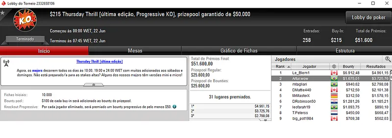 O maior vencedor foi Dennys "dennysramos2" Ramos que embolsou $10,682 no Thursday Thrill com 205 jogadores e $205,000 de prize pool. O jogador verde e amarelo terminou na quarta colocação da classificação. Diego "Mr.Bittar" Bittar terminou em sétimo e encaixou $6,126, enquanto fapk2212 recebeu $5,485 em 11º.