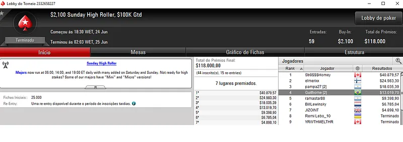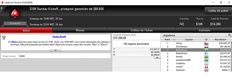 Já no Hotter $109 houve dobradinha brasileira com jason13-2008 a encaixar $17,557 na primeira colocação. A medalha de prata valeu $12,622 a gabiruboy entre as 1,082 entradas registadas. Este evento repartiu $108,200 pelos 179 melhores jogadores.