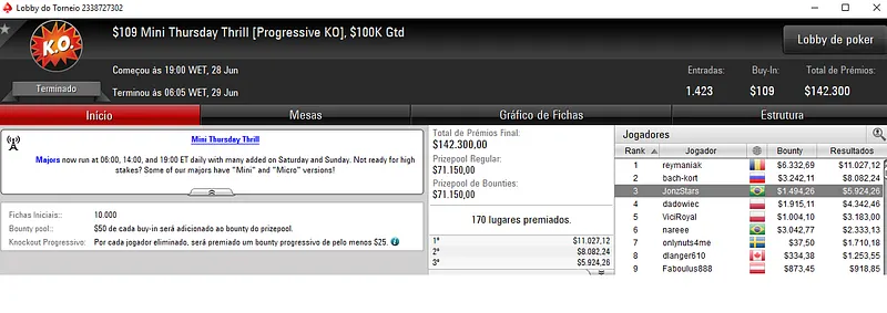 Já no Thursday Thrill Late Editon, com 29 jogadores, apareceu a cravada brasuca. ManafesTT forrou $11,328 pelo título e viu Fábio "F1oba" Maritan levar $3,560 na terceira colocação. Este torneio distribuiu $59,800 de prize pool.