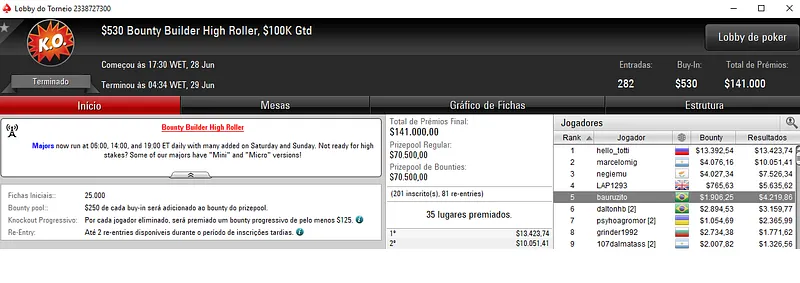 Também com uma boa forra saiu Gustavo "MachadinhaRS" Rocha no Bounty Builder $109 com 924 participantes. O jogador brasileiro levou para o caixa $7,611, entre prêmio e bounties.