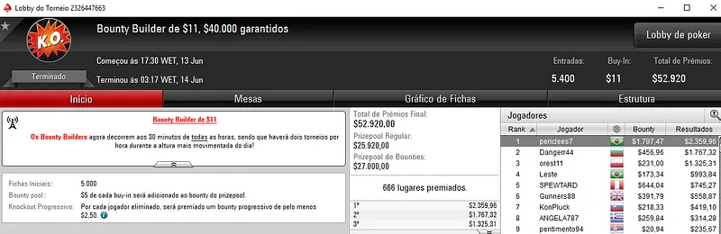 Outra cravada apareceu no Bounty Builder $33 com 2,457 entradas e $73,710 de prize pool. O jogador brasileiro pocavoya precisou de oito horas e meia para embolsar $8,308.