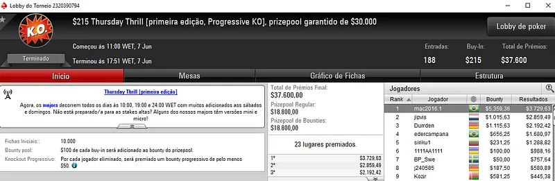 O Mini Thursday Thrill viu entrarem em jogo 1,764 jogadores para o o jogador brasileiro André "99Palanke" Luís sair com o título e $23,145 de premiação. Este evento contou com um prize pool acumulado de $176,400.