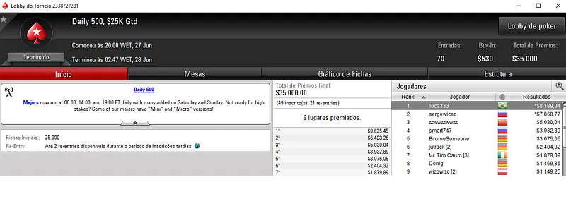 Já lilica333 foi o campeão do Daily 500 com 70 entradas e $35,000 de prize pool. O jogador nacional saiu com o título e $8,189 de prêmio, depois de realizar acordo no heads-up. Este torneio premiou os nove melhores classificados.