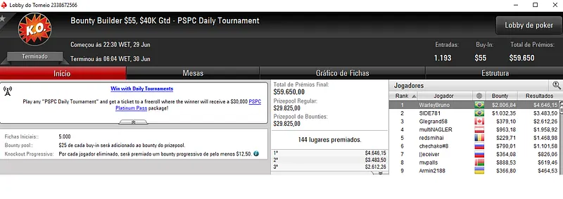 Já no Bounty Builder High Roller que costuma estar cheio de fera do poker online contou João "Joao Valli" Valli na segunda colocação. Este evento acolheu 196 entradas e o prize pool distribuído chegou nos $98,000. O jogador nacional faturou $10,233, entre prêmio e bounties.