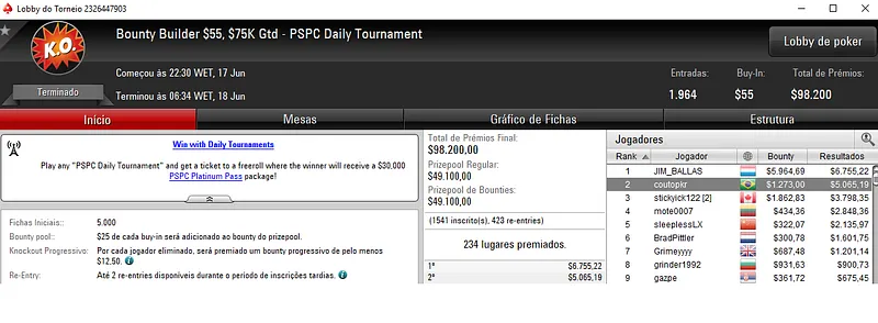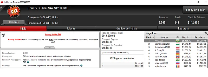 A medalha de prata valeu $30,526 a Thiago "KKremate" Crema no Bounty Builder High Roller. Este torneio com 663 entradas distribuiu um prize pool acumulado de $331,500.