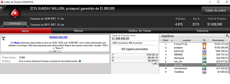 Eduardo "SAFADA1" Fay sambou nas mesas do Mini Sunday Million com 7,886 entradas. O jogador brasuca forrou $19,970 e viu serem distribuídos $157,720 pelos 1,574 melhores classificados.