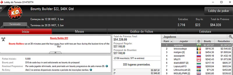 Também com a medalha de prata saiu Francesco "F P C" Conte no Bounty Builder $109 com 3,108 participantes e $301,800 de prize pool. O jogador brasuca encaixou $20,158, entre prêmio e bounties neste torneio.