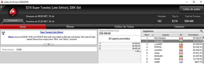 Já o craque Ariel "ArielBahia" Bahia também se deu bem nos feltros do PokerStars e embolsou $19,180 pela medalha de bronze no $1,050 Super Tuesday. Este evento contou com 164 entradas, que se traduziram em 23 lugares premiados.