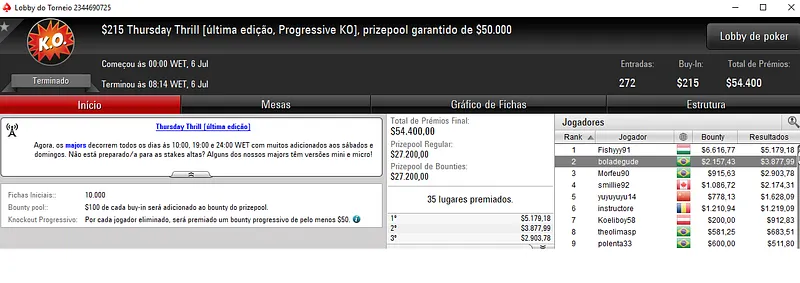 O maior prêmio trouxe também uma dobradinha nacional. O Mini Thursday Thrill contou com 1,532 jogadores e o prize pool acumulado chegou nos $153,200. No topo da classificação, alenmocelin96 embolsou $21,541, entre prêmio e bounties, com Brunodellas a encaixar $10,460 na segunda colocação.