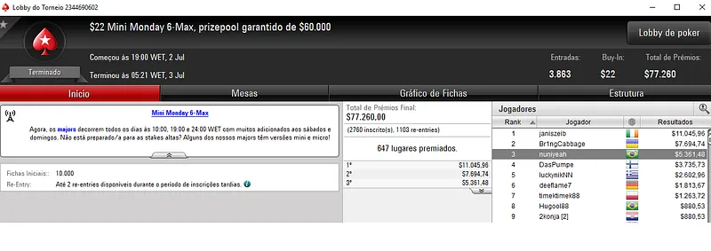 Fred "fred_volpe" Volpe foi um desses nomes e o craque saiu com a vitória do $109 Monday 6-Max [Late Edition] com 365 jogadores. A medalha de ouro valeu $6,651, entre os 65 jogadores que dividiram os $36,500 de prize pool.