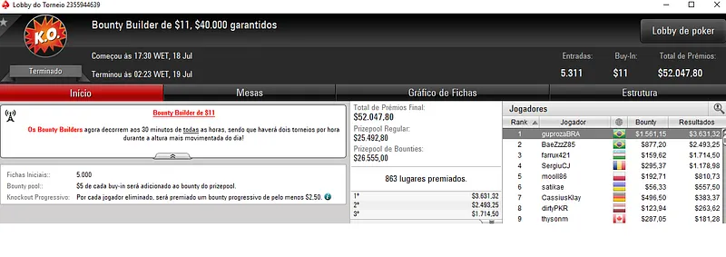 Já no sempre difícil field do Bounty Builder High Roller houve dobradinha brasuca. Ovinho_Bra saiu com o título e $22,402 de premiação. Na segunda colocação, Henrique "Galochina10" Coutinho teve direito a $14,115. Foram distribuídos $124,500 de prize pool neste evento que contou com 249 entradas.