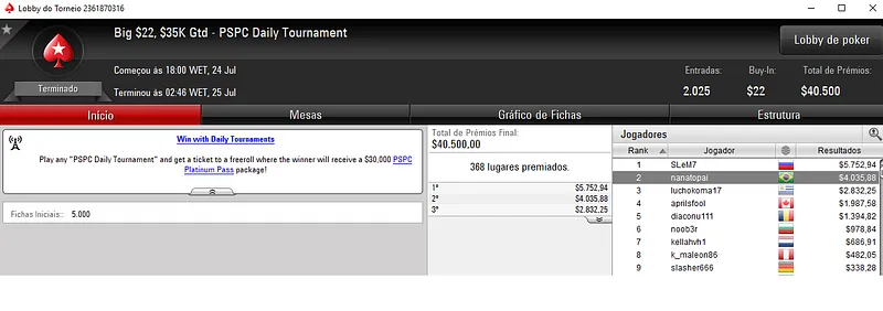 Outros Resultados no PokerStars: