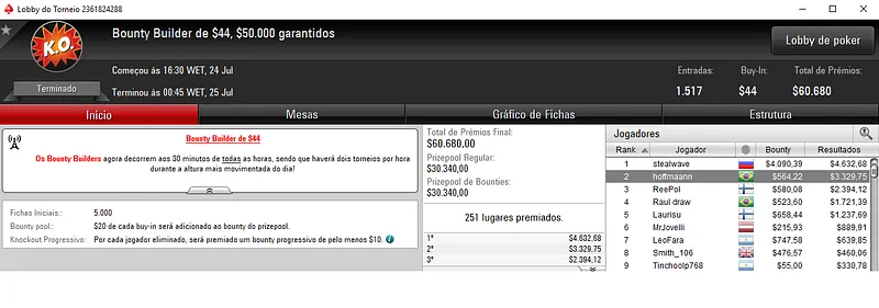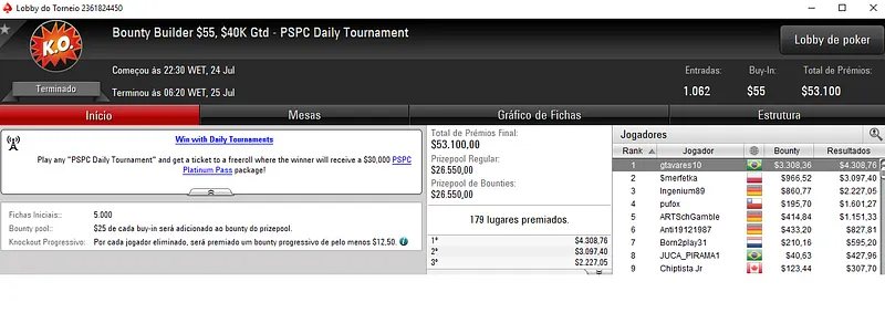 Douglas "Dowgh-Santos" Ferreira cravou o Bounty Builder $33 e saiu com $8,508, entre prêmio e bounties. Este evento acolheu 2,254 participantes e o prize pool acumulado chegou nos $67,620.
