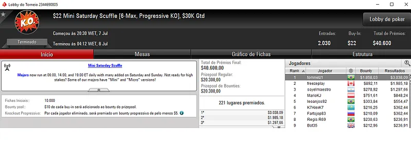 A maior forra aconteceu nas mesas do Bounty Builder High Roller com 185 entradas. Este evento teve um prize pool de $92,500, onde Pablo "pabritz" Brito Silva encaixou $21,305, entre prêmio e bounties. Com a amedalha de bronze, reyals_rs teve direito a $6,346, enquanto frredd ainda recebeu $3,470 na oitava colocação.