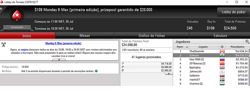 A reta de segunda foi bem mais modesta nos resultados online, mas mesmo assim vários jogadores nacionais conquistaram títulos importantes no PokerStars.