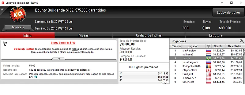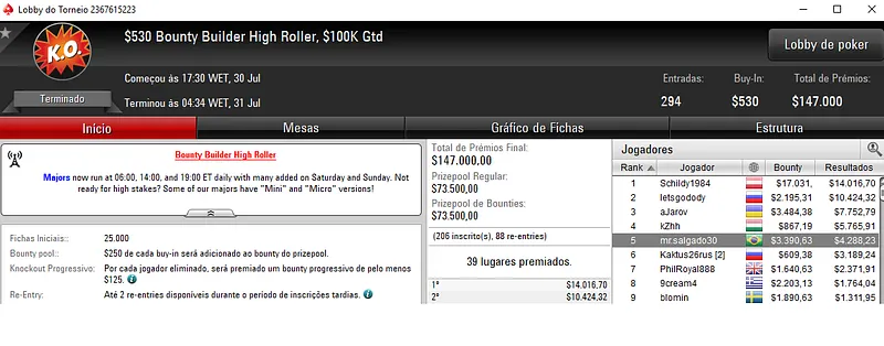 O jogador nacional ainda faturou também no Bounty Builder $162, onde a cravada valeu mais $6,317. Na segunda colocação, SOUFODAMS recebeu $4,868. Este torneio acolheu 283 jogadores e o prize pool chegou aos $42,450