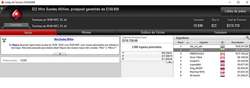 Já no Sunday Million, o Brasil foi representado por jricardosc que levou para a sua conta $27,190 de premiação pelo sexto lugar. Este torneio acolheu 5,916 entradas e o prize pool de $1,183,200 foi distribuído pelos 1,052 melhores classificados.
