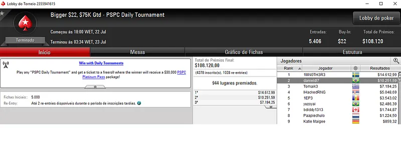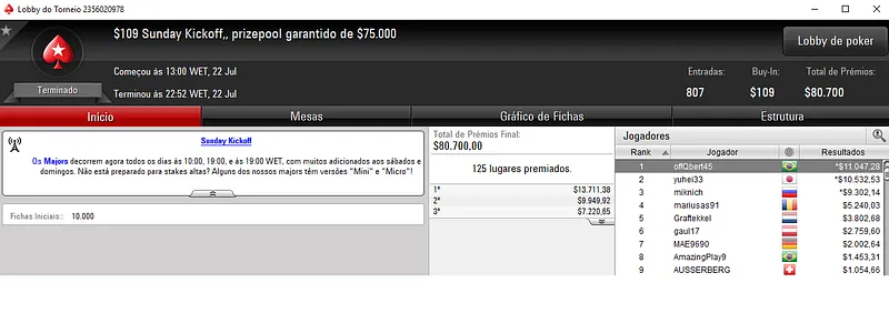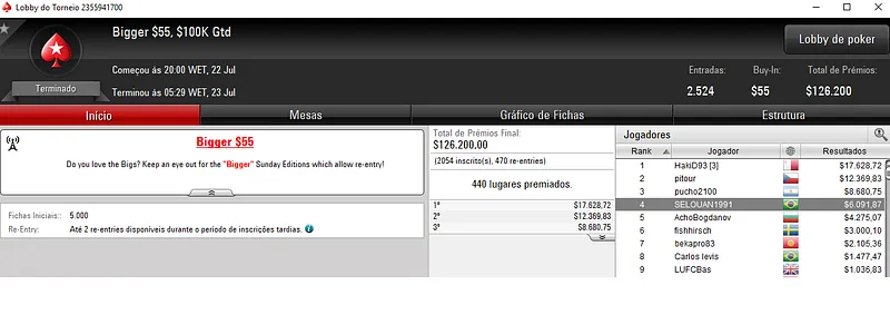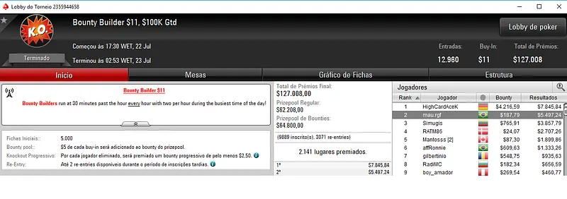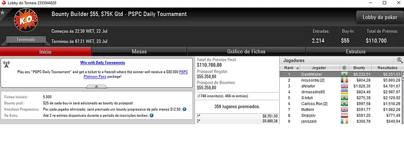 O grande vencedor desta super reta de poker foi Zanetti89 que puxou o tíutlo no Bounty Builder $109 com 2,902 entradas e $290,200 de prize pool. O jogador nacional não deu chances e embolsou $35,622, entre prêmio e bounties.