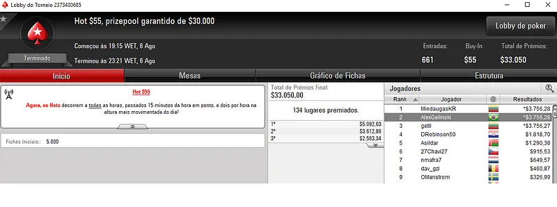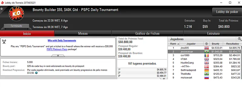 Já CezarEgger13 conseguiu a cravada no Bounty Builder $33 com 2,495 participantes e $74,850 de prize pool. O jogador nacional faturou $9,534, entre prêmio e bounties neste torneio.