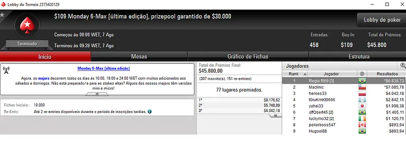 Ontem, a maior premiação apareceu com a medalha de prata de Dennys "dennysramos2" Ramos no Mini Monday 6-Max. Com 4,937 entradas, este torneio distribuiu $98,740 pelos 815 melhores jogadores em prova. O jogador brasileiro embolsou $9,790 e ainda viu HenriquinAK sair com $6,822 junto com a medalha de bronze e E.Shandler encaixar $4,753 em quarto.