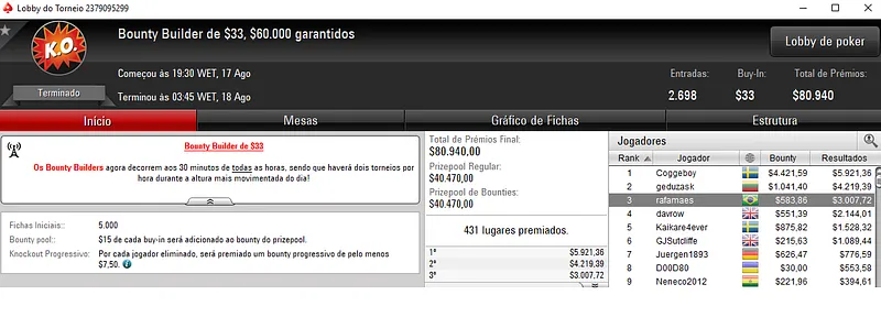 DArtargnan foi mesmo o maior vencedor ao conquistar o Bounty Builder $109 com 965 participantes. O prize pool deste evento chegou nos $96,500 e oara o jogador brasuca ficaram reservados $15,909, entre prêmio e bounties.