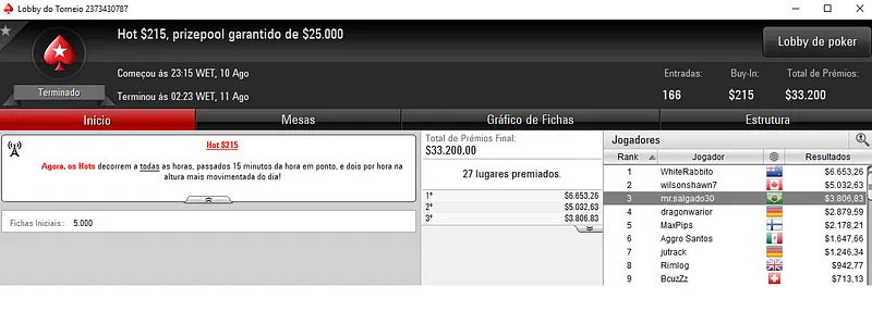 Já no $215 Fast Friday, João não facilitou e apenas foi travado no heads-up. O segundo lugar neste torneio com 271 entradas valeu $7,314 de premiação. No total, 47 jogadores dividiram os $54,200 de prize pool acumulado.