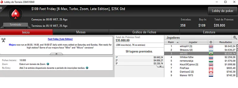 Já no Bounty Builder $109 com 991 participantes, JeF Dosso também saiu na segunda colocação e embolsou $7,246. Este torneio distribuiu um prize pool de $99,100.
