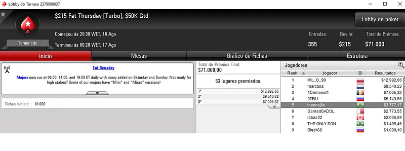 Com dois jogadores brasileiros no pódio, o $215 Thursday Thrill acolheu 331 entradas que se transformaram em $66,200 de prize pool. A medalha de prata valeu $7,786 a Jessé "jessecesar" Cesar Fonseca, enquanto Ricardo "ricardons8" Nascimento recebeu $4,897 na colocação seguinte.