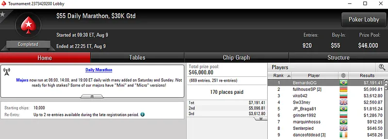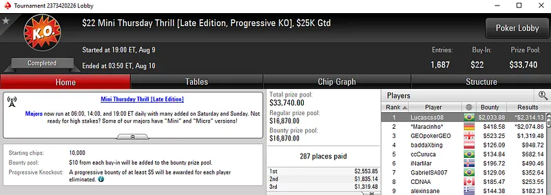 Outra cravada apareceu no $109 Mini Thursday Thrill com 1,737 entradas e $173,700 de prize pool. Bráulio "bianchettibh" Bianchetti recebeu a medalha de ouro e $21,411 de premiação. O terceiro lugar valeu $7,904 a gobbi#9, enquanto doughbrun levou $5,533 em quinto.