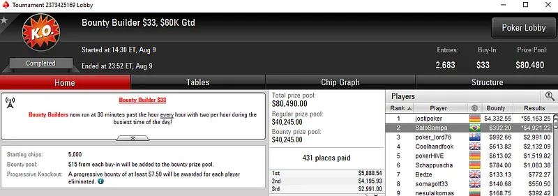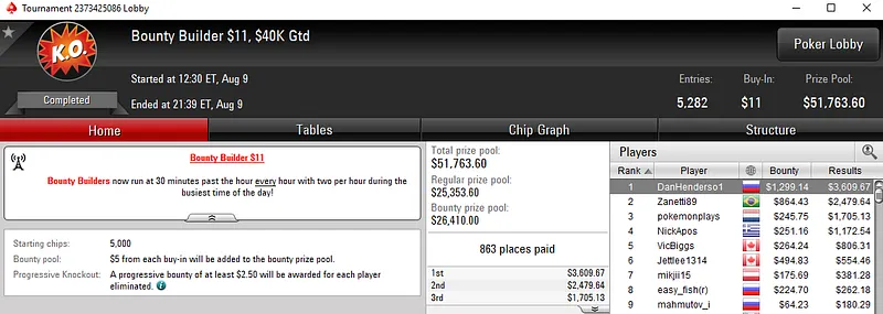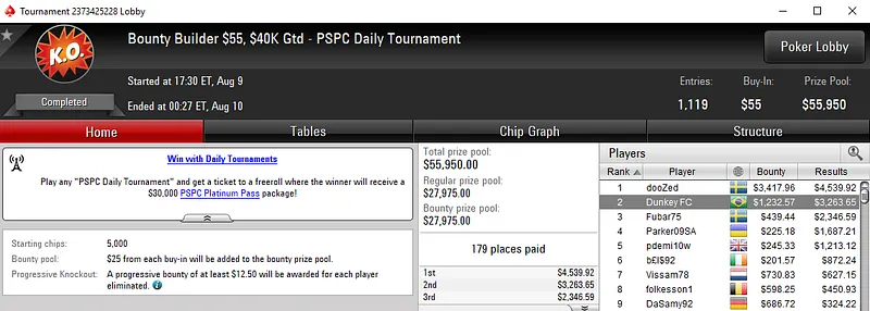 Já no Bounty Builder $109, Lincon deixou todo o mundo para trás e forrou mais $15,545. Aqui, participaram 1,050 jogadores que perfizeram um prize pool de $105,000. Na quarta colocação, odemoura ainda faturou $5,076.