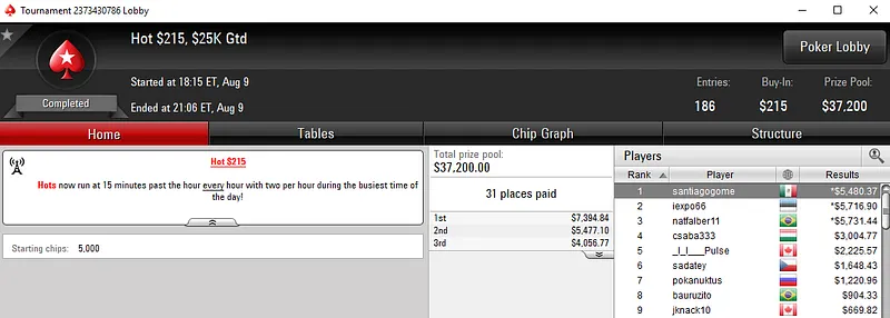 Rodrigo "SELOUAN1991" Selouan não quis ficar de fora da festa e conquistou o $215 Fat Thursday com 345 entradas e $60,000 de prize pool. O jogador nacional encaixou $12,856 e viu Guithome na quarta colocação receber $5,098.