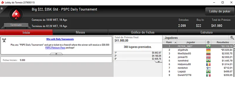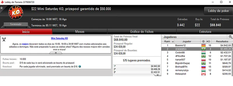 Já no Bounty Builder $44 houve nova cravada brasuca. Desta vez, DomSocci 777 levou a melhor perante 2,024 adversários e embolsou $8,271, entre prêmio e bounties. Este torneio distribuiu $81,000 de prize pool.