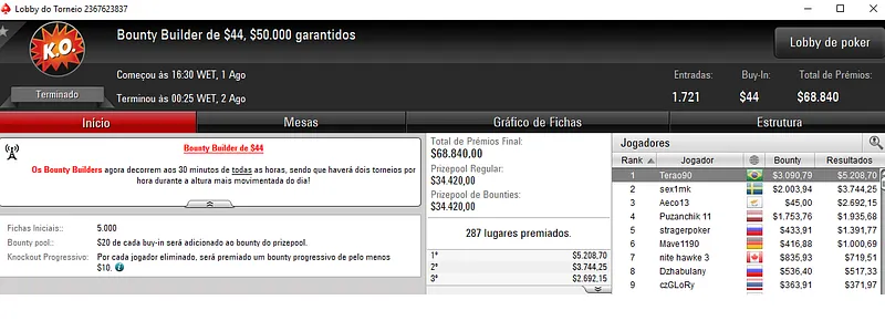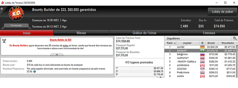 Já no Bounty Builder $109 houve nova cravada brasuca com escabofildo a receber $15,315 pela vitória. Aqui, participaram 1,033 jogadores e o prize pool chegou aos $103,300. Com a medalha de bronze, wendellau teve direito a $5,051, e otaviobraga a $3,026 em quinto.