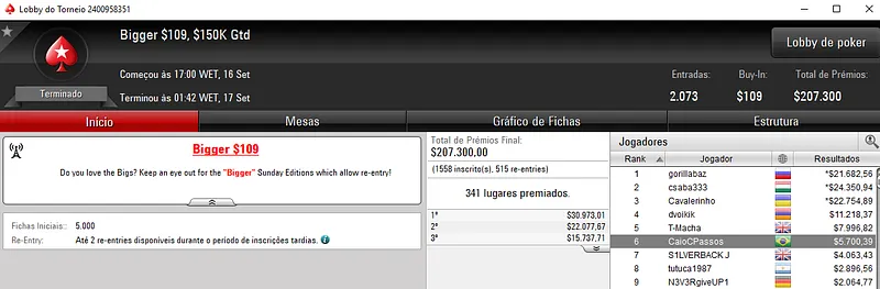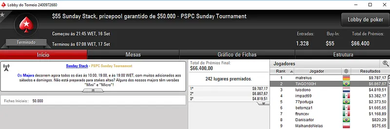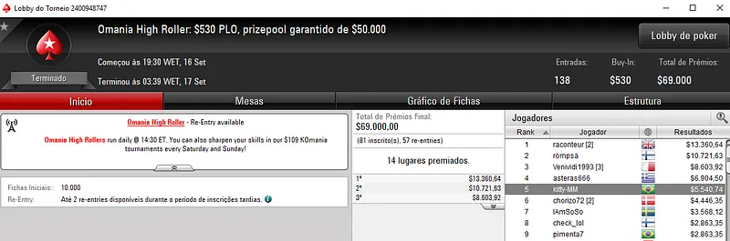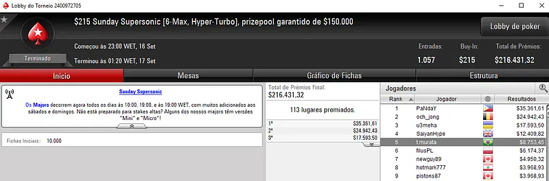 A cravada de Mulatin181 valeu $23,892. O jogador verde e amarelo foi o mais forte no $55 Sunday Marathon com 3,503 entradas e $175,150 de prize pool. Gordinho90 foi quarto classificado e recebeu $8,256 de premiação.