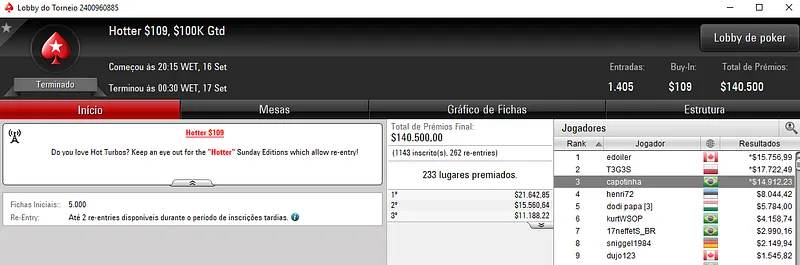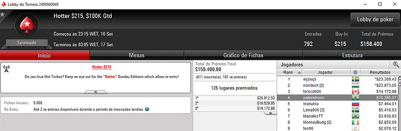 Já no Hotter $11, o título entre as 9,012 entradas valeu mais $8,564. Aqui, DJORFF fez acordo com zecanino no heads-up que recebeu $7,822.