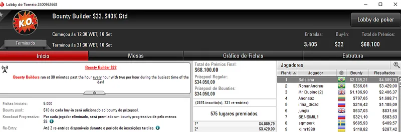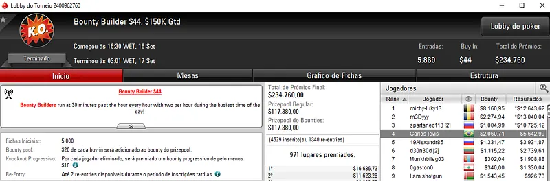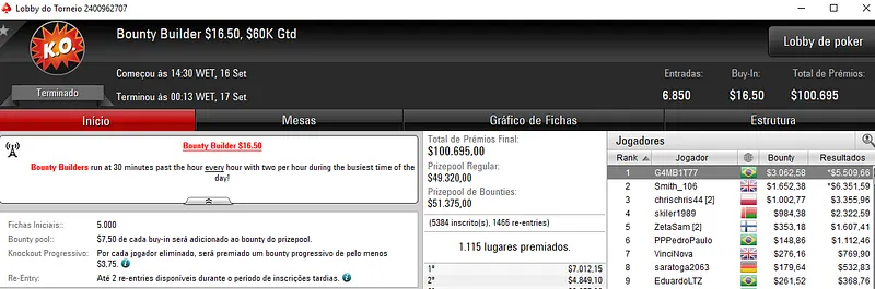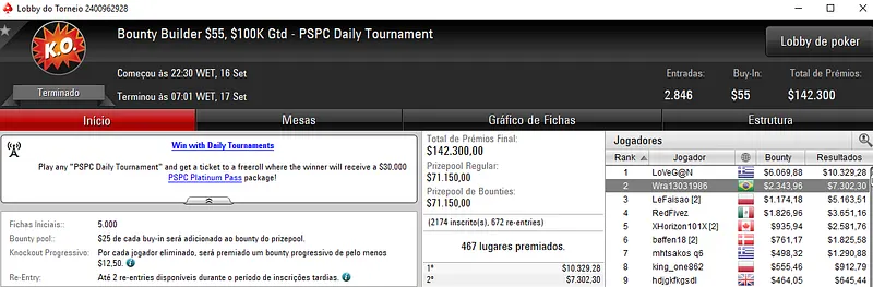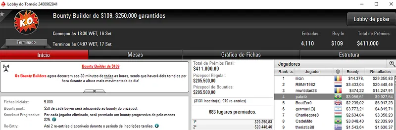 DJORFF foi um desses casos. O jogador nacional cravou dois torneios importantes e forrou mais de $26,000. A maior premiação apareceu com a vitória no Bounty Builder $33 com 7,355 entradas e $220,650 de prize pool. DJORFF levou para o caixa $17,929, entre prêmio e bounties.