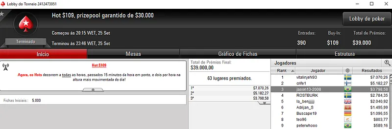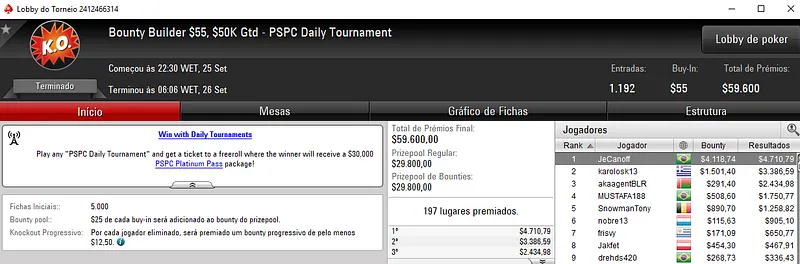 Quem também se deu bem foi edu22.sp que cravou o Bounty Builder $215 com 316 entradas e $63,200 de prize pool. A medalha de ouro valeu $12,205, entre prêmio e bounties.