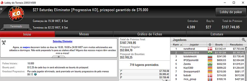 Já Geraldo "GeraldoCesar" Neto mantém sua boa forma no poker online e levou para o caixa $7,997 no Saturday Scuffle, onde caiu na terceira colocação. Com 450 participates, este evento acumulou um prize pool de $90,000.