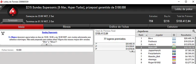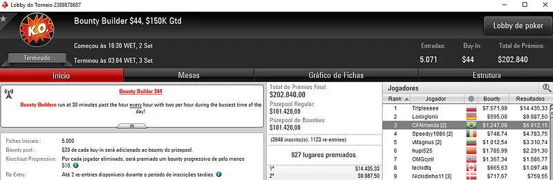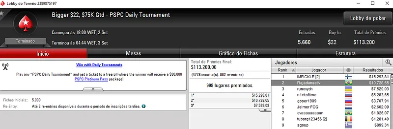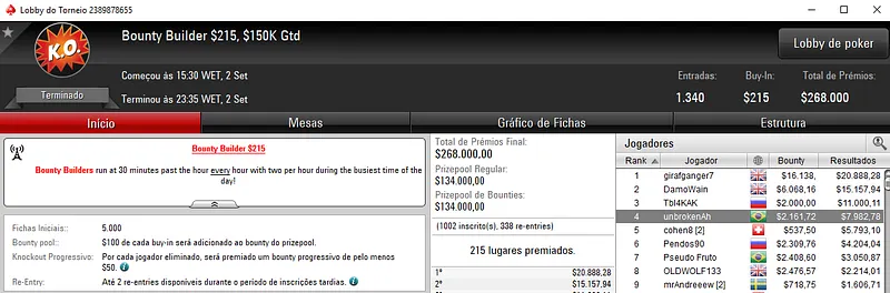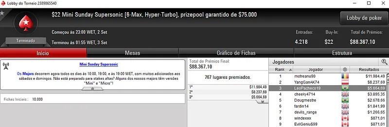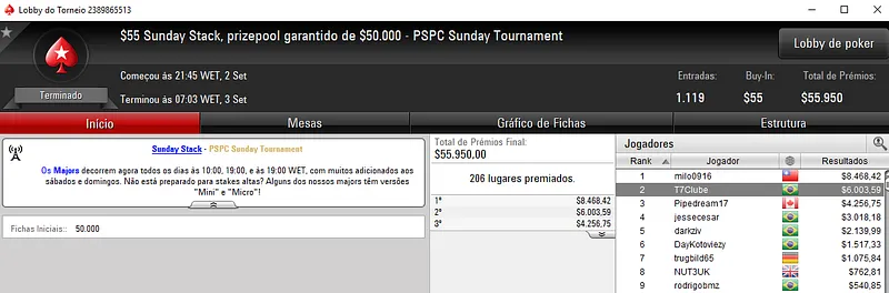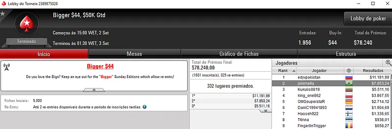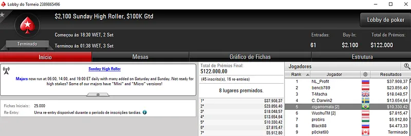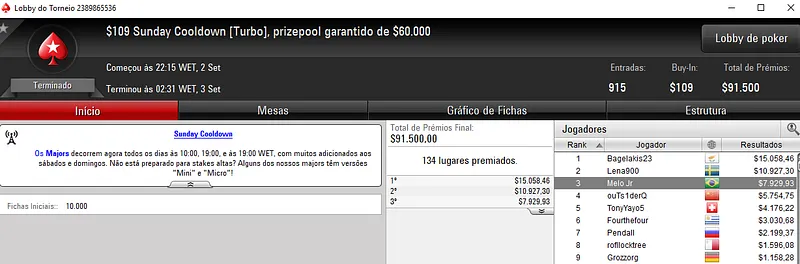 Já no Sunday Marathon com 2,925 entradas houve dobradinha verde e amarela. Ihrvini foi o campeão e forrou $20,156, enquanto Formigah052 recebeu $14,144 na segunda colocação.