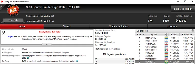 O maior prêmio apareceu com a vitória de Ivan "ivan limeira" Limeira no Bigger $109 com 1,572 entradas e $157,200 de prize pool. O nosso grinder não deu chances e embolsou $20,531 de premiação depois de fazer acordo no heads-up com julianpineda.