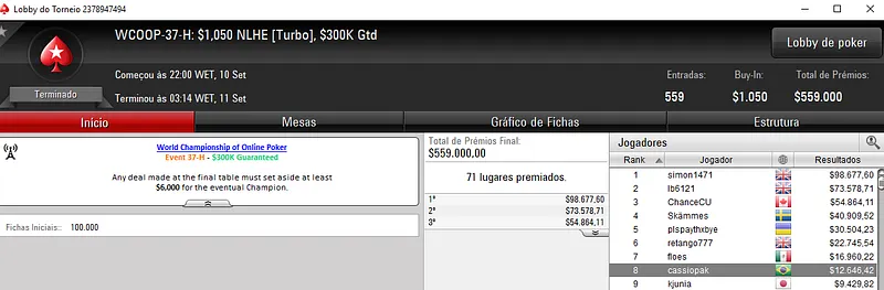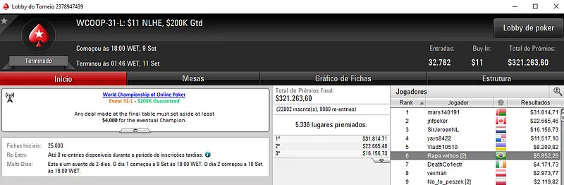 Já no WCOOP #30-Medium também teve cravada brasuca! O evento com 1,856 entradas viu João "XxJoaoFeraxX" Fera embolsar $126,350 pelo título, depois de fazer acordo no heads-up. O torneio contou com $928,000 de premiação e Bruno "great dant" Volkmann saiu na mesa final para embolsar $25,675 em sexto. Já Adrovan "AadrovanRj21" Rodrigues foi nono e recebeu $9,299.